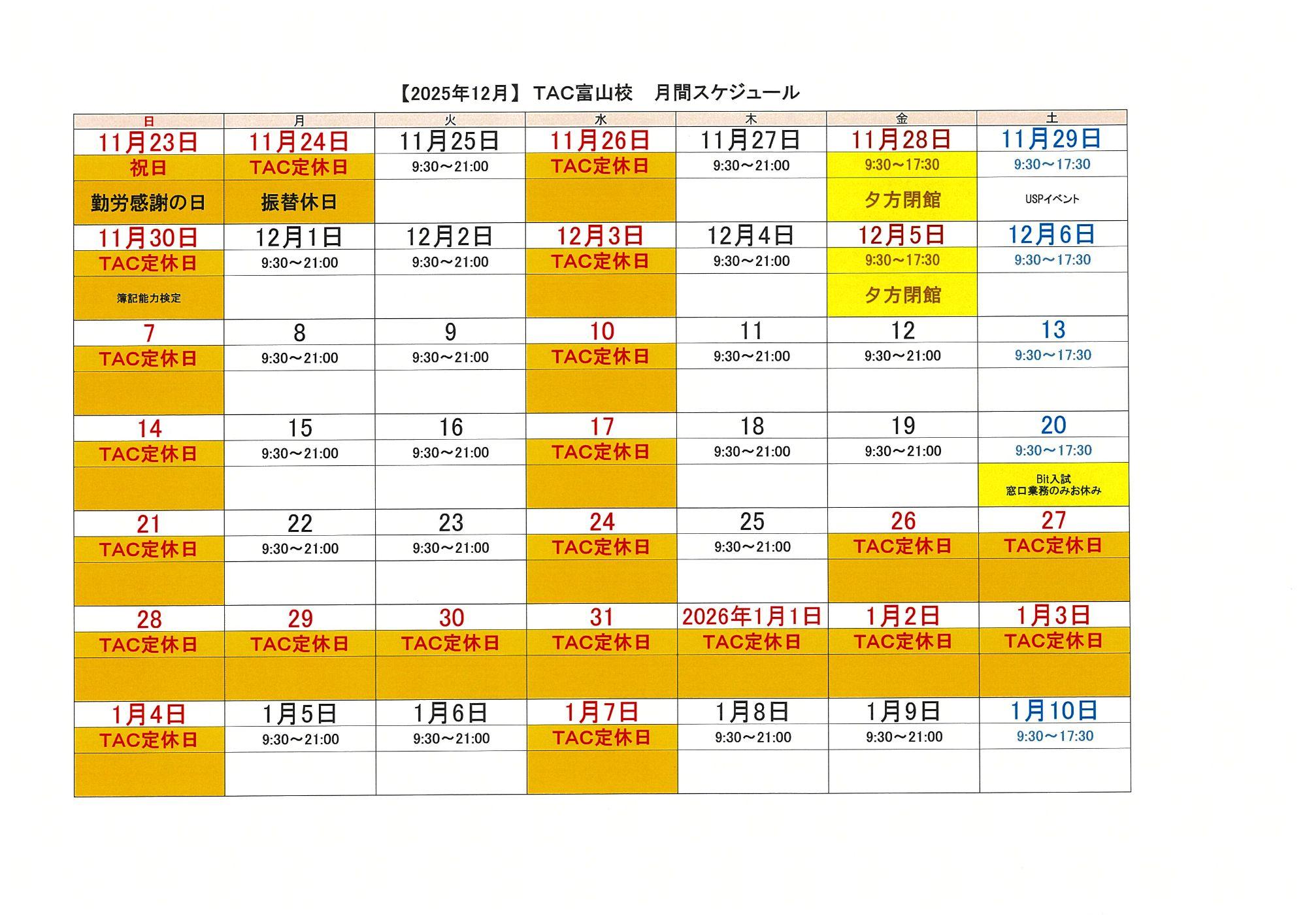 2025年12月26日(金)~2026年1月4日(日)までTAC富山校は冬季休暇となります。すべての営業活動がお休みとなります。勿論、自習室も使用できません。