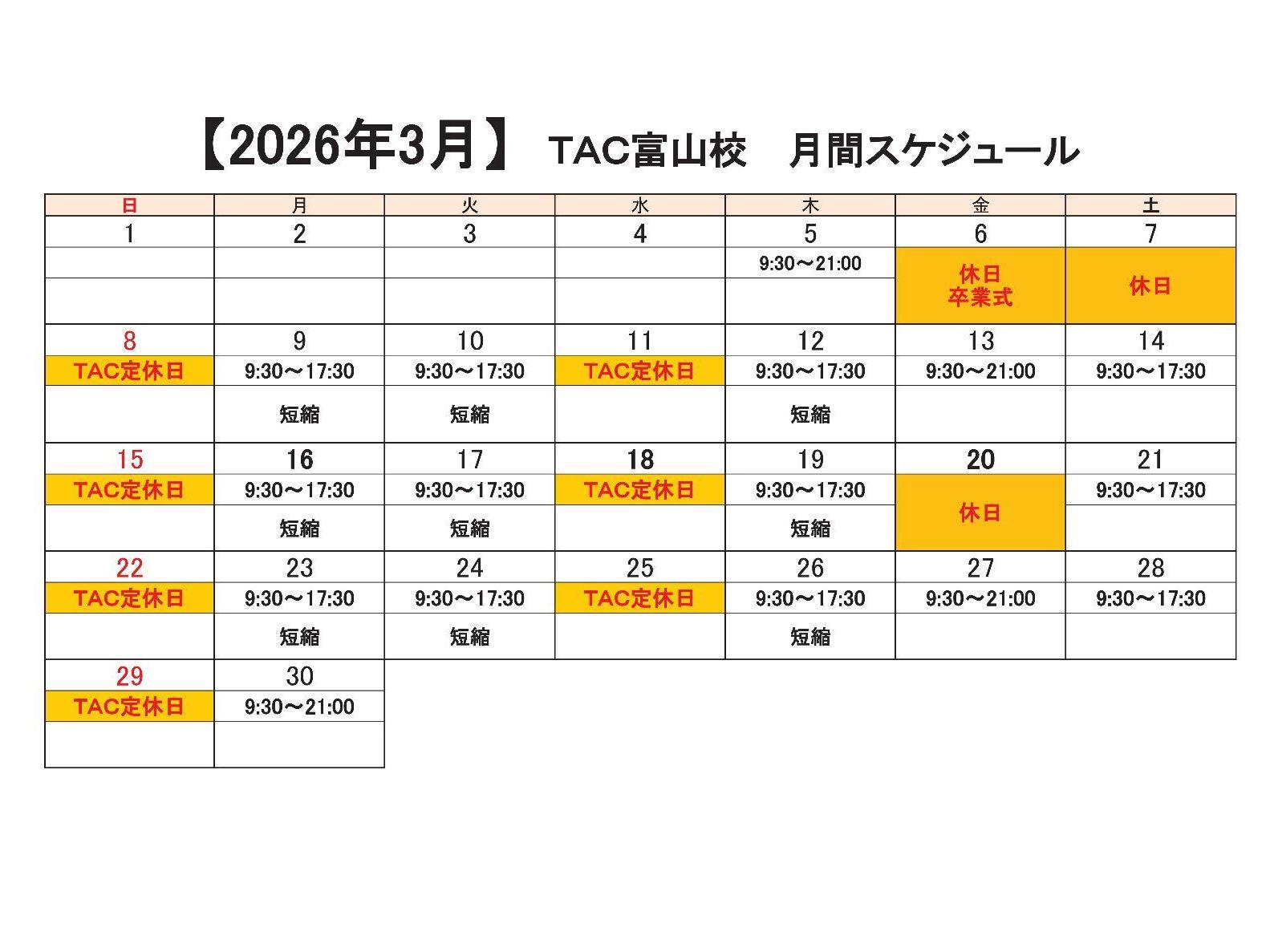TAC3月営業スケジュール