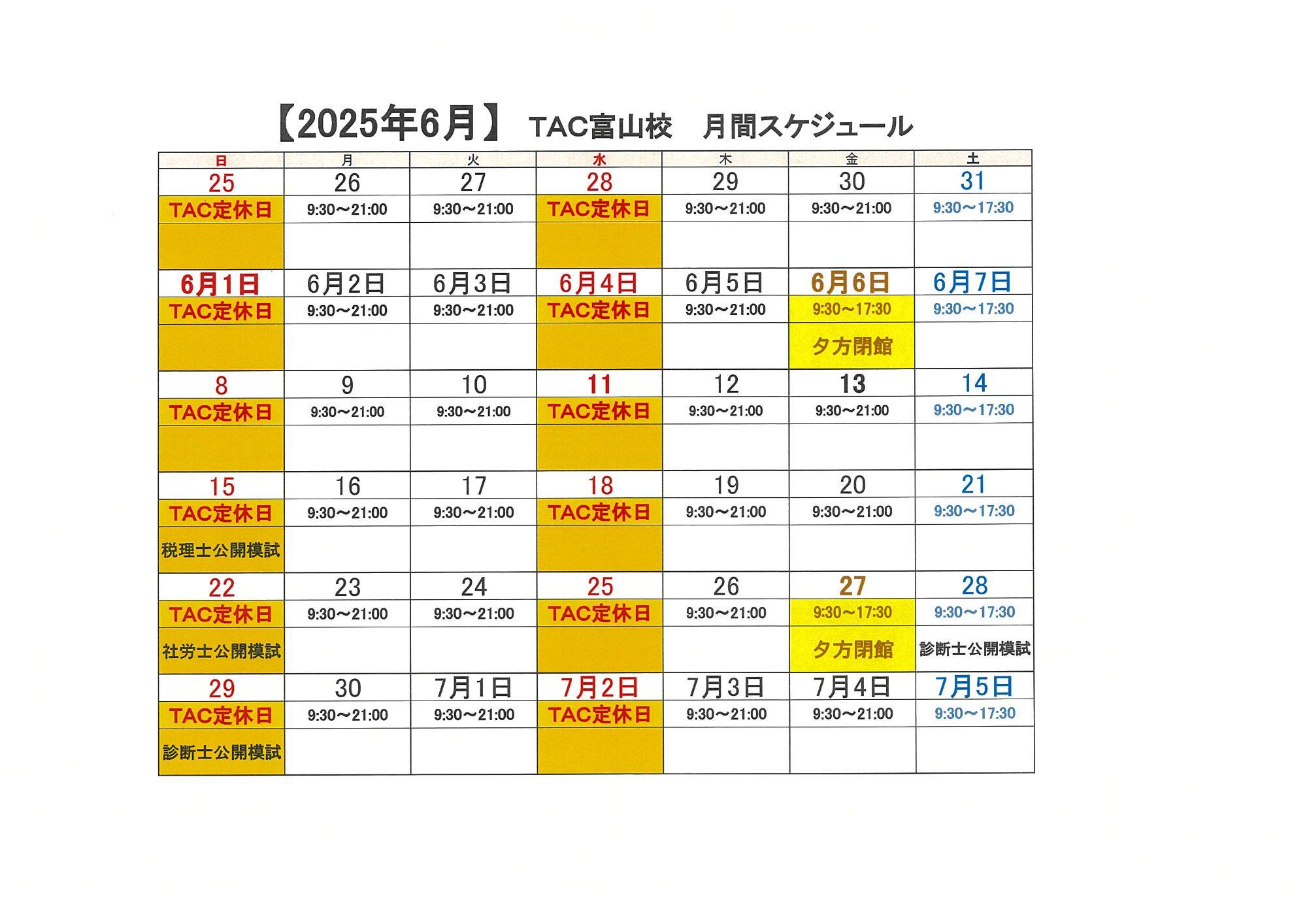 TAC富山校12月営業スケジュール ①12月20日(土)は17:30分閉館 自習、Web通信学習は可能です。 受講相談、受講申込はできません。 ②12月25日(木)は19:00分閉館 自習、Web通信学習は可能です。19時で終了です。 受講相談、受講申込も19時で終了となります。