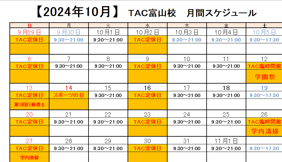 TAC10月営業休み日の変更(10月26日臨時閉館)