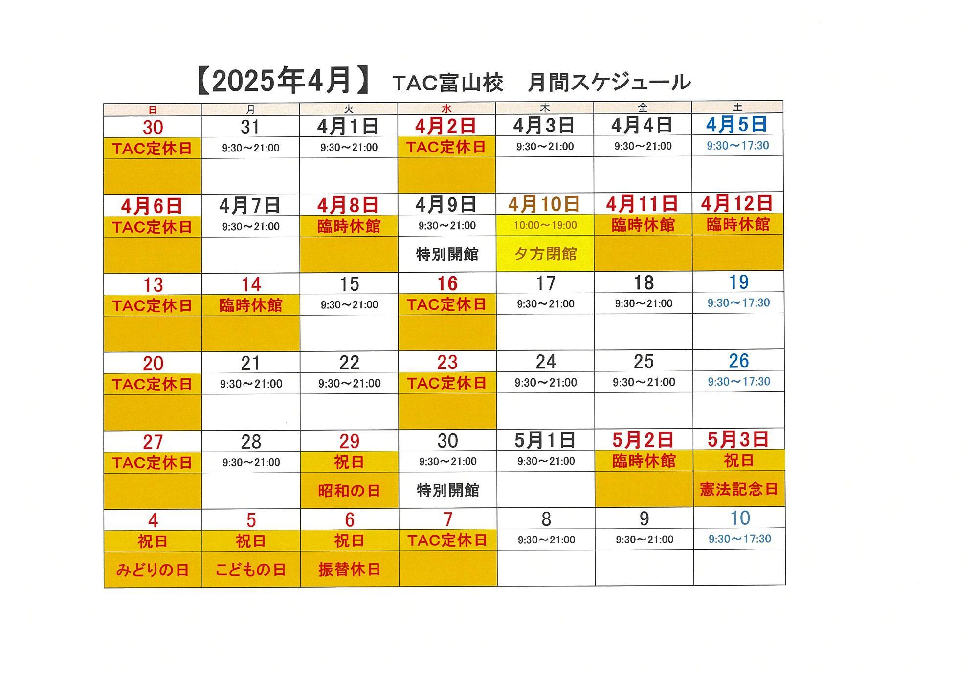 TAC富山校の4月および5月2週目までの営業スケジールです。