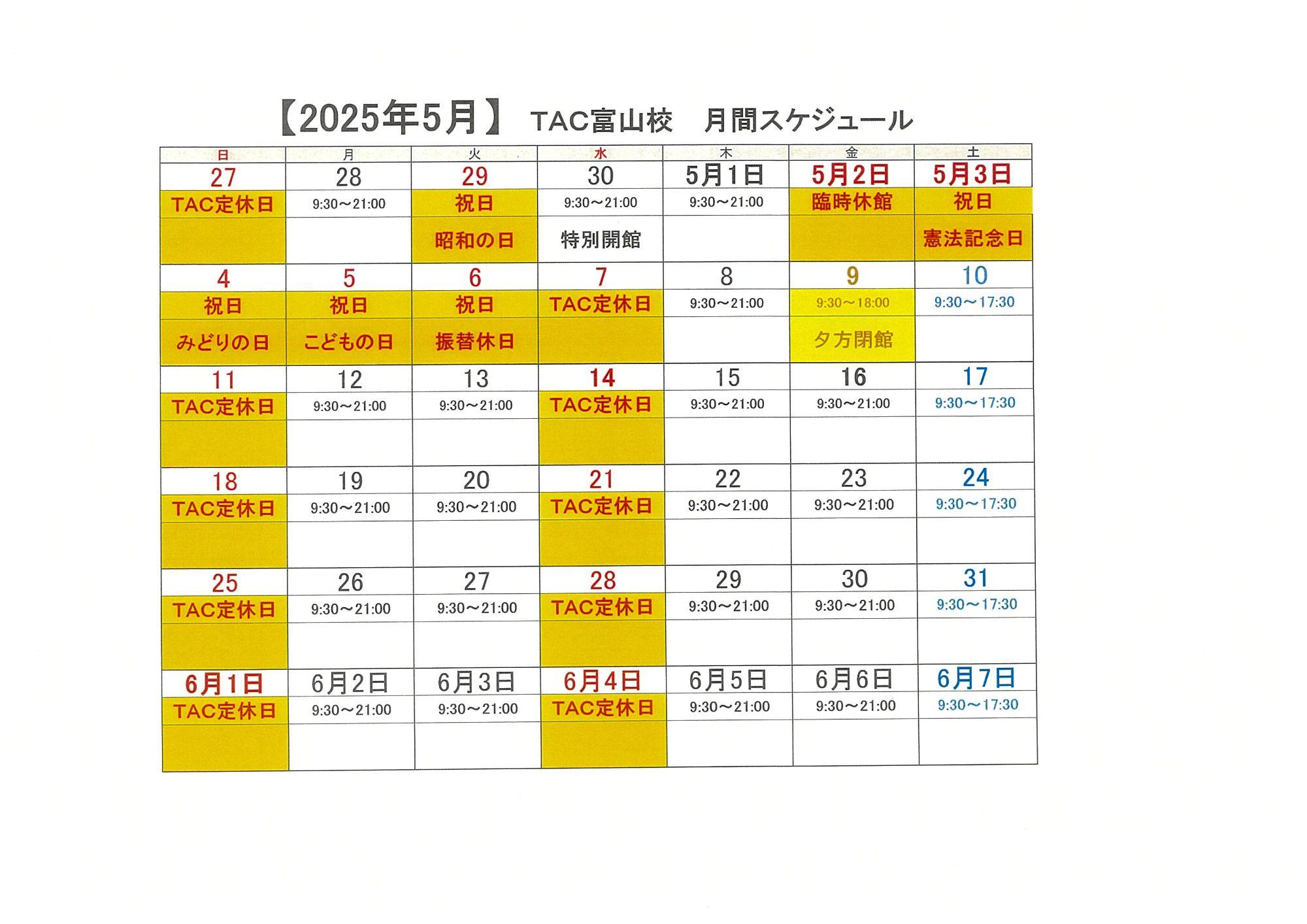 TAC富山校のGW連休は5月2日(金)~5月7日(水)の6日間となります。ご不便をお掛けしますが、ご理解ください。